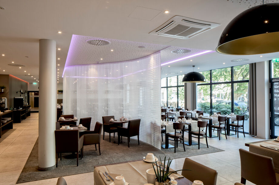 Betritt der Gast das Looken Inn, erwartet ihn eine großzügige, lichtdurchflutete Lobby. Diese wird von KaCool D ebenso klimatisiert, wie der geräumige Frühstücksraum und das angrenzende Szenelokal. Insgesamt sind 11 der in sechs Baugrößen erhältlichen Deckenkassetten im Hotel installiert. Für den einheitlichen Look wurden die Blenden passend zum Interieur lackiert. Die KaCool Deckenkassette heizt, kühlt und lässt sich problemlos in die Gebäudeautomation einbinden.