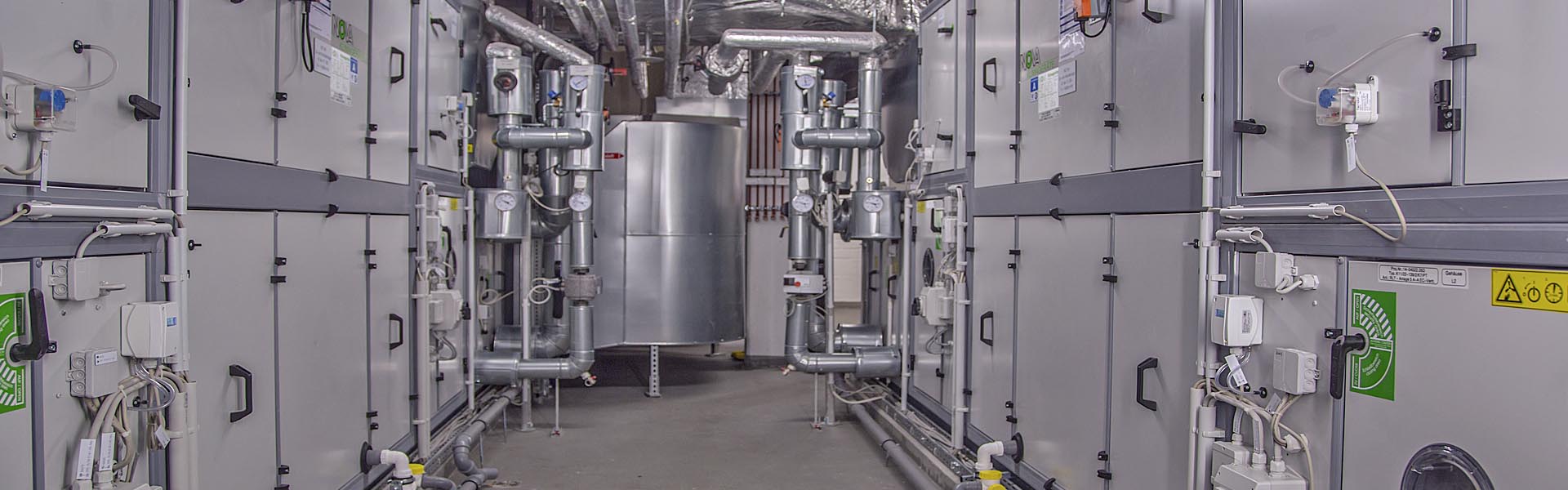 Das zentrale RLT-Gerät für die Küche mit 14.500 m³/h sind gem. VDI 2052 ausgeführt. Die Abluftventilatoren sind gekapselt und fremdbelüftet. Das WRG-System wurde mit einem Kreislaufverbundsystem ausgeführt, um die Luftwege hygienisch vollständig voneinander zu trennen.