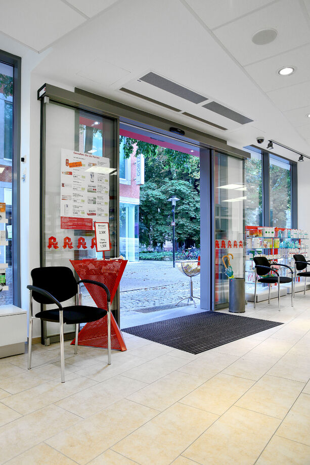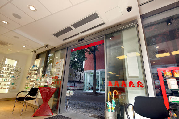 Die Apotheke kann ihre Kundschaft in zentraler Innenstadtlage mit offenen Türen begrüßen, während Kassetten-UniLine Türluftschleier effektiv Energieverluste senken. Die Geräte schützen im Winter vor Kaltlufteinfall und reduzieren im Sommer eindringende Warmluft.
