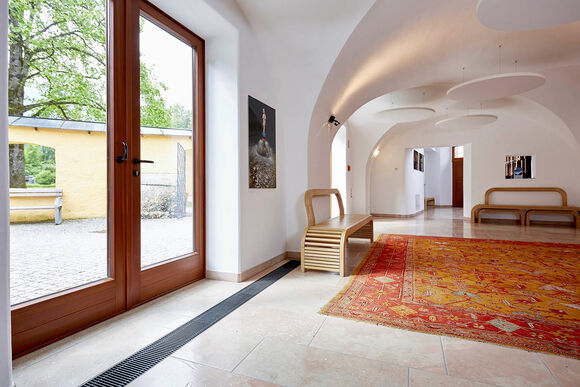 Im Schloss Hellbrunn sorgen die Konvektoren vor den großen Fensterflächen im neuen Gastrobereich und im Aufenthaltraum für eine effektive Kaltluftabschirmung. Dabei passen die bronze eloxierten Roste wunderbar zur rustikalen Inneneinrichtung.