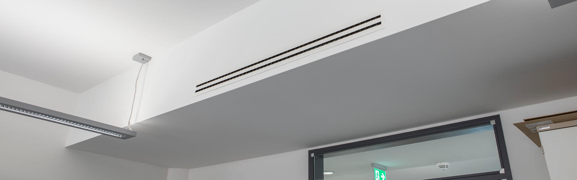 Die Wahrheit ist, dass oftmals Luftdurchlässe platziert werden, die für moderne Büroräume überdimensioniert sind. Der tatsächliche Bedarf an Zu- und Abluft ermöglicht hingegen den Einsatz sehr dezenter Endgeräte. Die Klima Kombischlitzdurchlässe greifen genau hier an und vereinen Zu- und Abluft in einem optisch unauffälligen System.