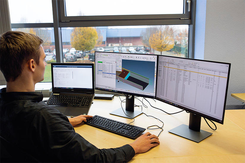 Marcel erklärt uns am Bildschirm, wie er eine Sonderlänge erstellt. Er ruft zunächst das Standardmodell auf und und dehnt die Bodenwanne in die gewünschte Länge. Anschließend muss er diverse Anpassungen vornehmen und unter anderem Stanzungen und Umformungen verrücken. Dabei gilt es darauf zu achten, dass Umformungen wie etwa Gewinde nicht zu dicht beieinander liegen, da sie sonst im Stanz- und Nibbelautomaten plattgedrückt werden können. Wenn das Sondergerät fertig konstruiert ist, werden die 2D-Zeichnungen mit den Abwicklungsdaten erzeugt und daraus die Stückliste abgeleitet. Die Blechzeichnungen liegen dann zweimal (einmal mit und einmal ohne Biegelinien) vor.